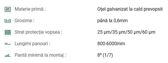 Confecţionate din oțel zincat şi acoperite cu vopsea cu finisaj lucios sau mat, panourile de tablă fălțuită Click se pot instala pe pante de min 8°.