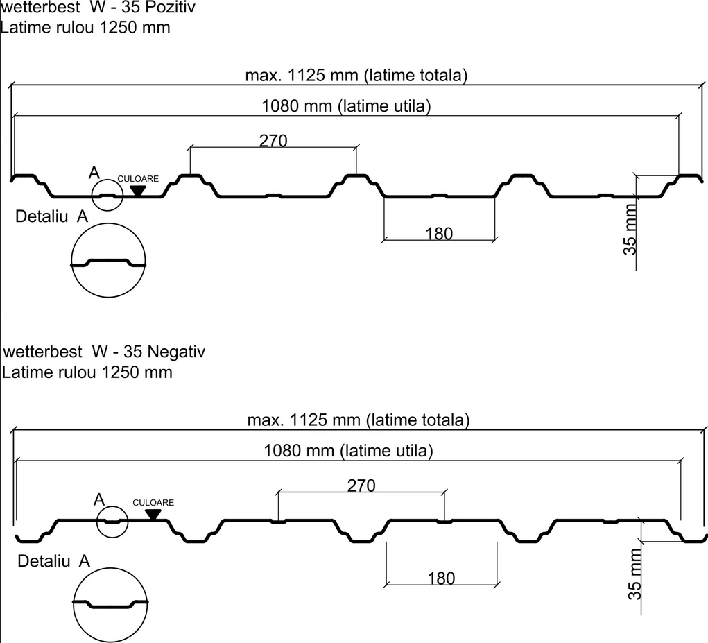 Panourile de tablă cutată Wetterbest W35 cu profil trapezoidal sunt folosite la placări în cazul proiectelor industriale, la exteriorul, respectiv interiorul construcţiilor, pentru acoperişuri, pereţi şi diverse aplicaţii cu rol estetic, cât şi pentru acoperirea construcţiilor civile (case, blocuri, birouri) şi placarea gardurilor şi a zonelor de sageac ale acoperişurilor.